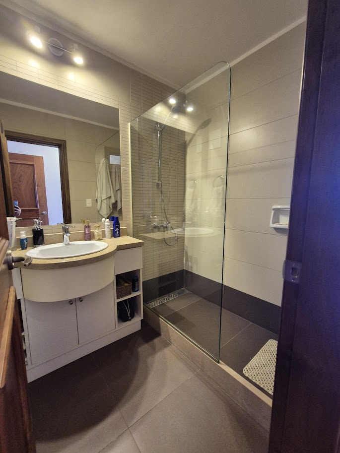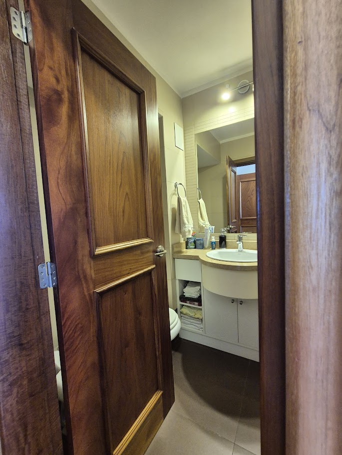 Cuenta con tres baños en total, uno social y dos en suite. El edificio ofrece servicios de portería 24 horas, dos ascensores, acceso vehicular y peatonal con control remoto, salón de fitness equipado, sauna masculino y femenino, solarium panorámico, garage y box.