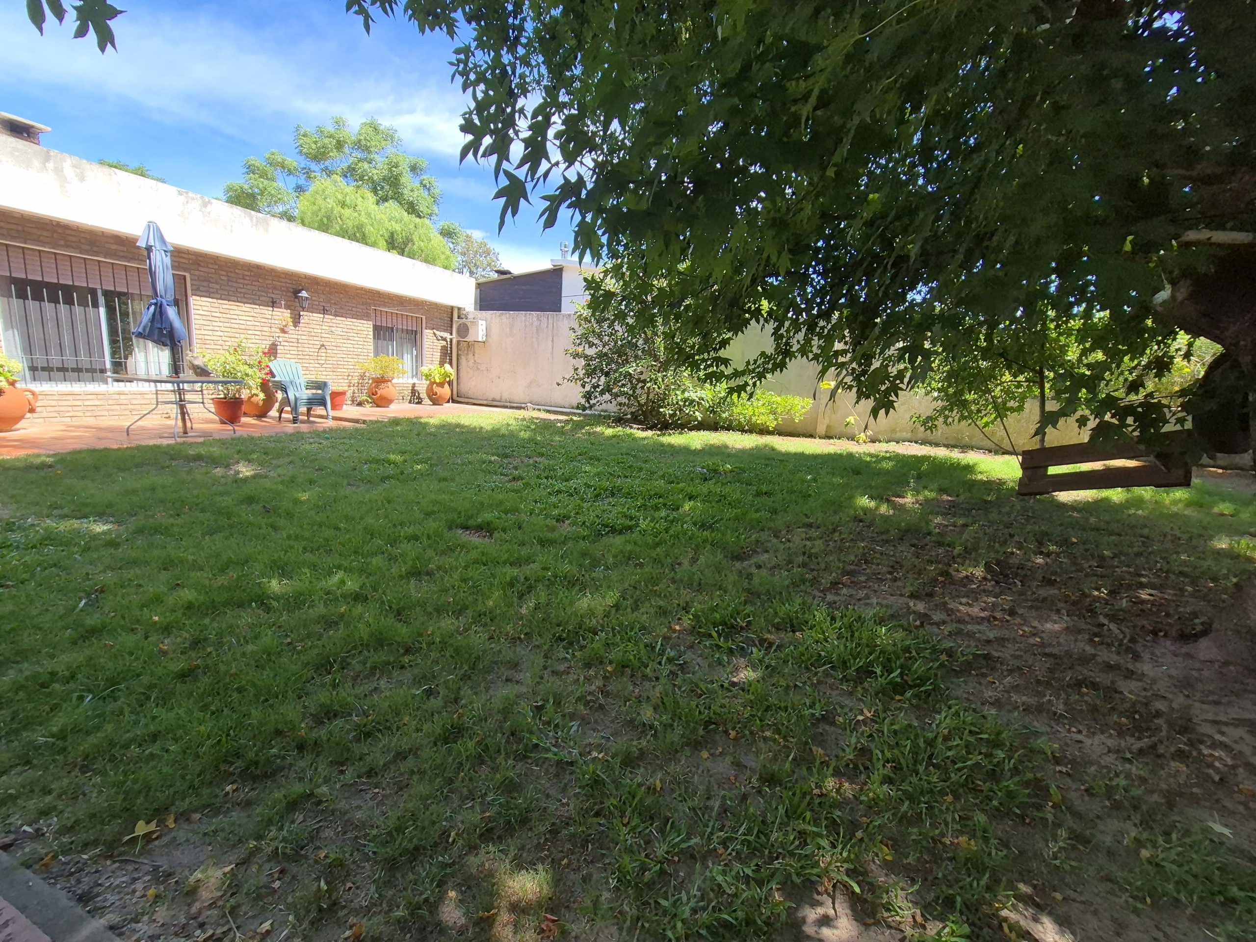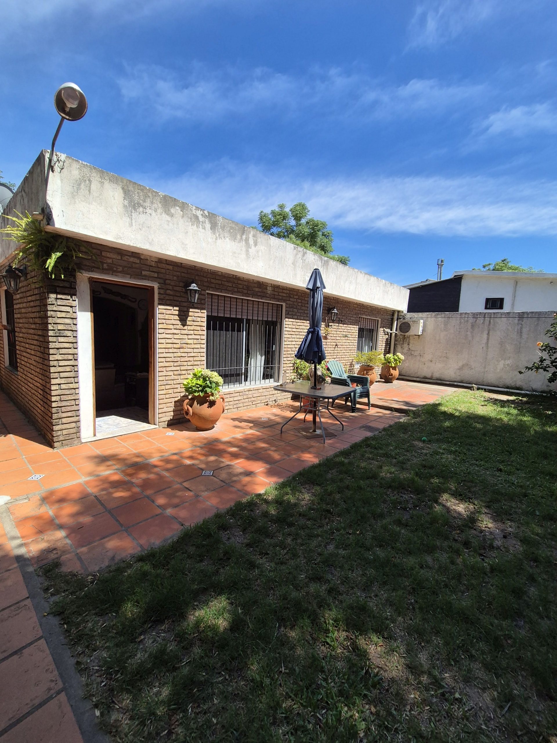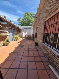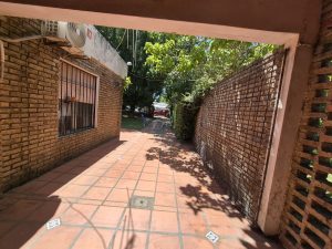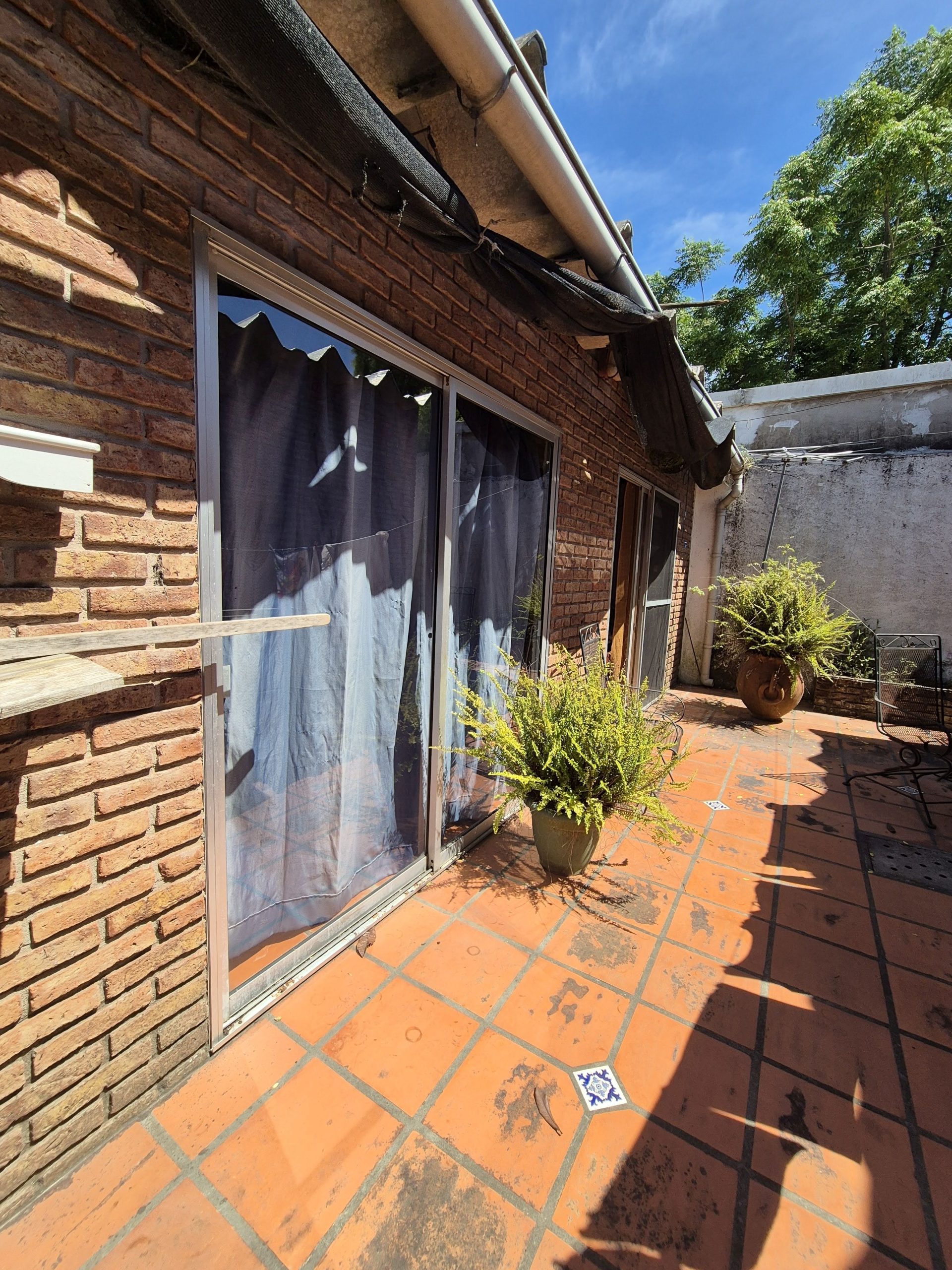 El patio está revestido en cerámica y se extiende hacia áreas de descanso y circulación. La propiedad incluye espacio para estacionamiento bajo techo, aunque no cuenta con portón automático