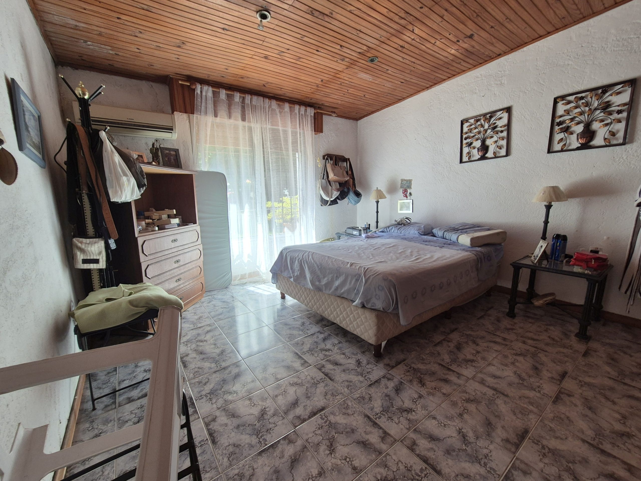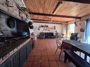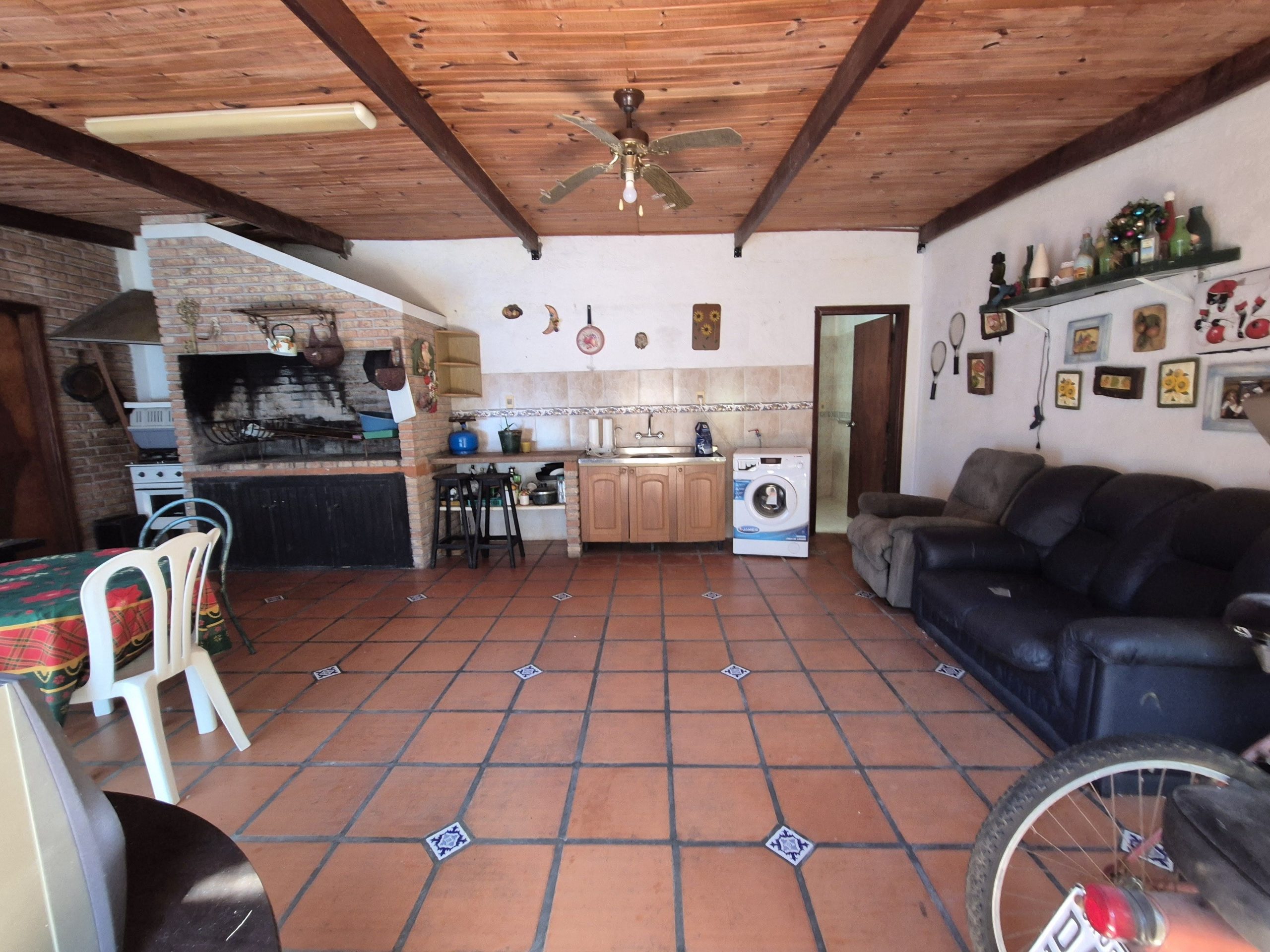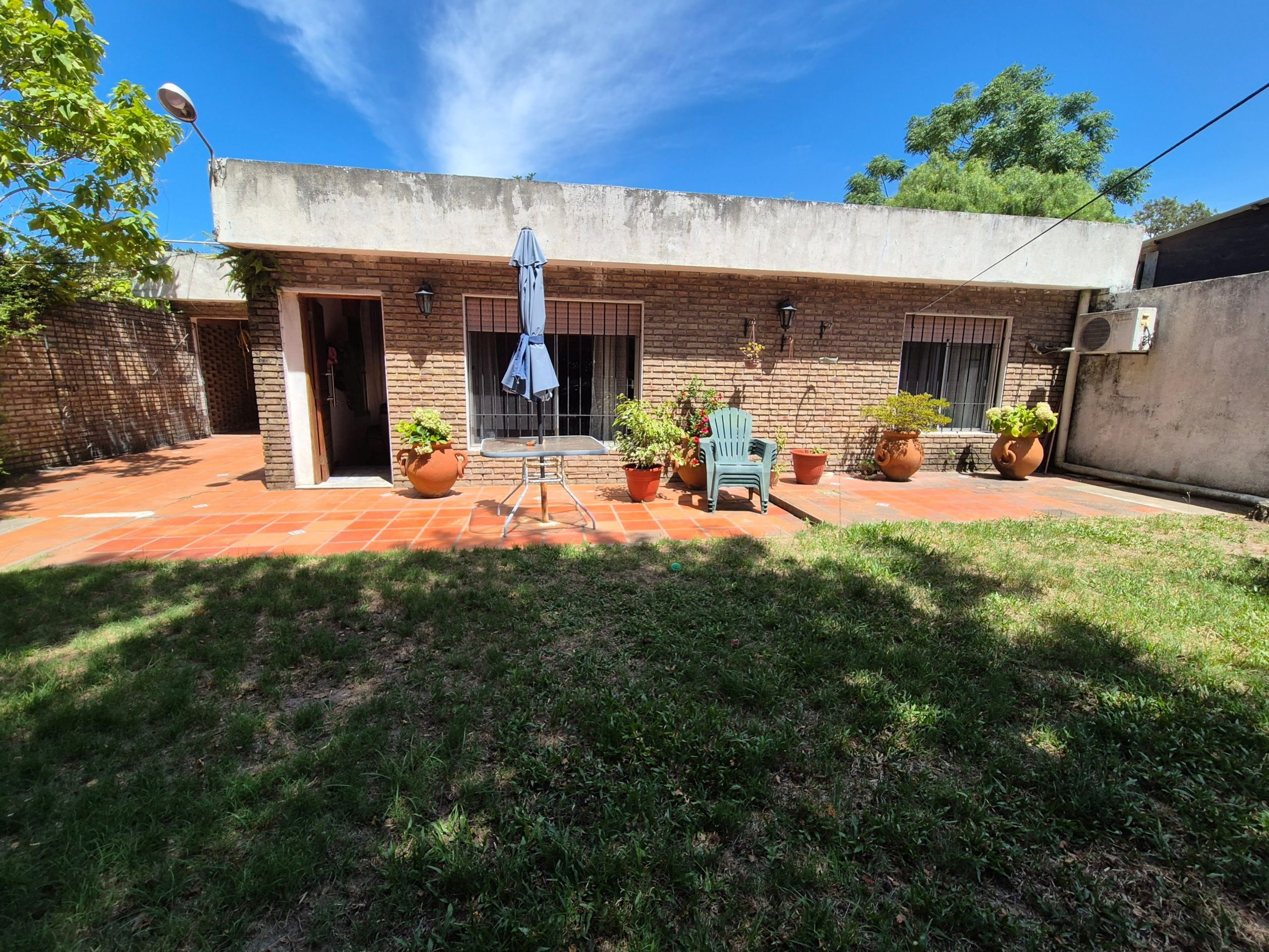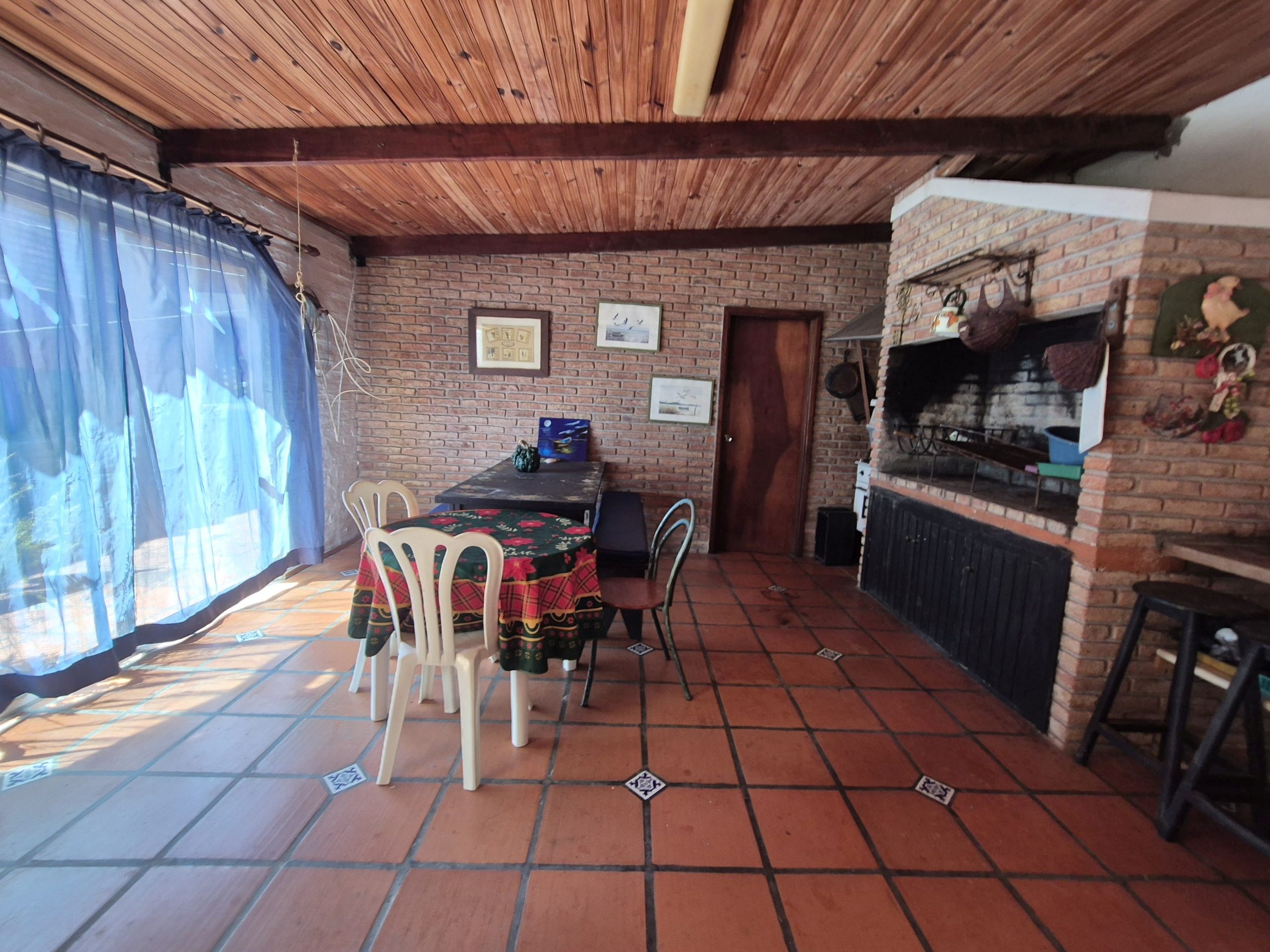 El patio está revestido en cerámica y se extiende hacia áreas de descanso y circulación. La propiedad incluye espacio para estacionamiento bajo techo, aunque no cuenta con portón automático