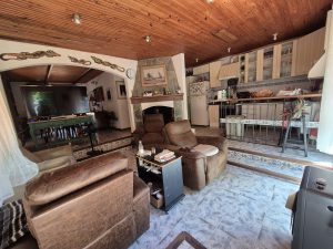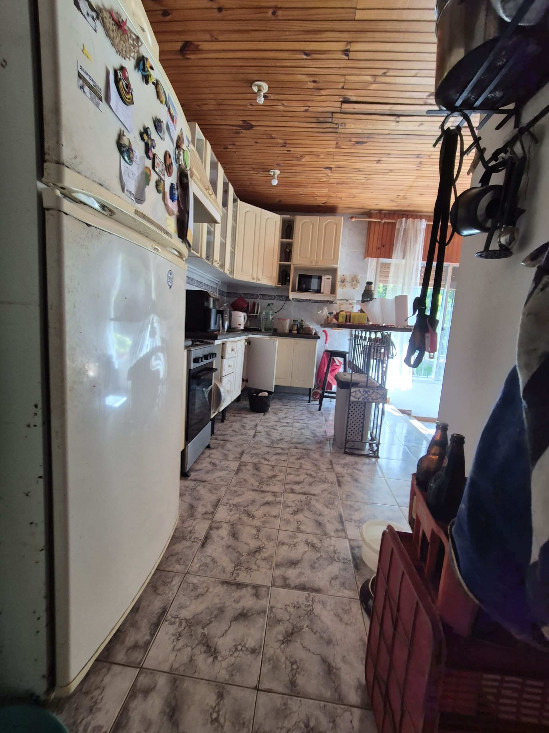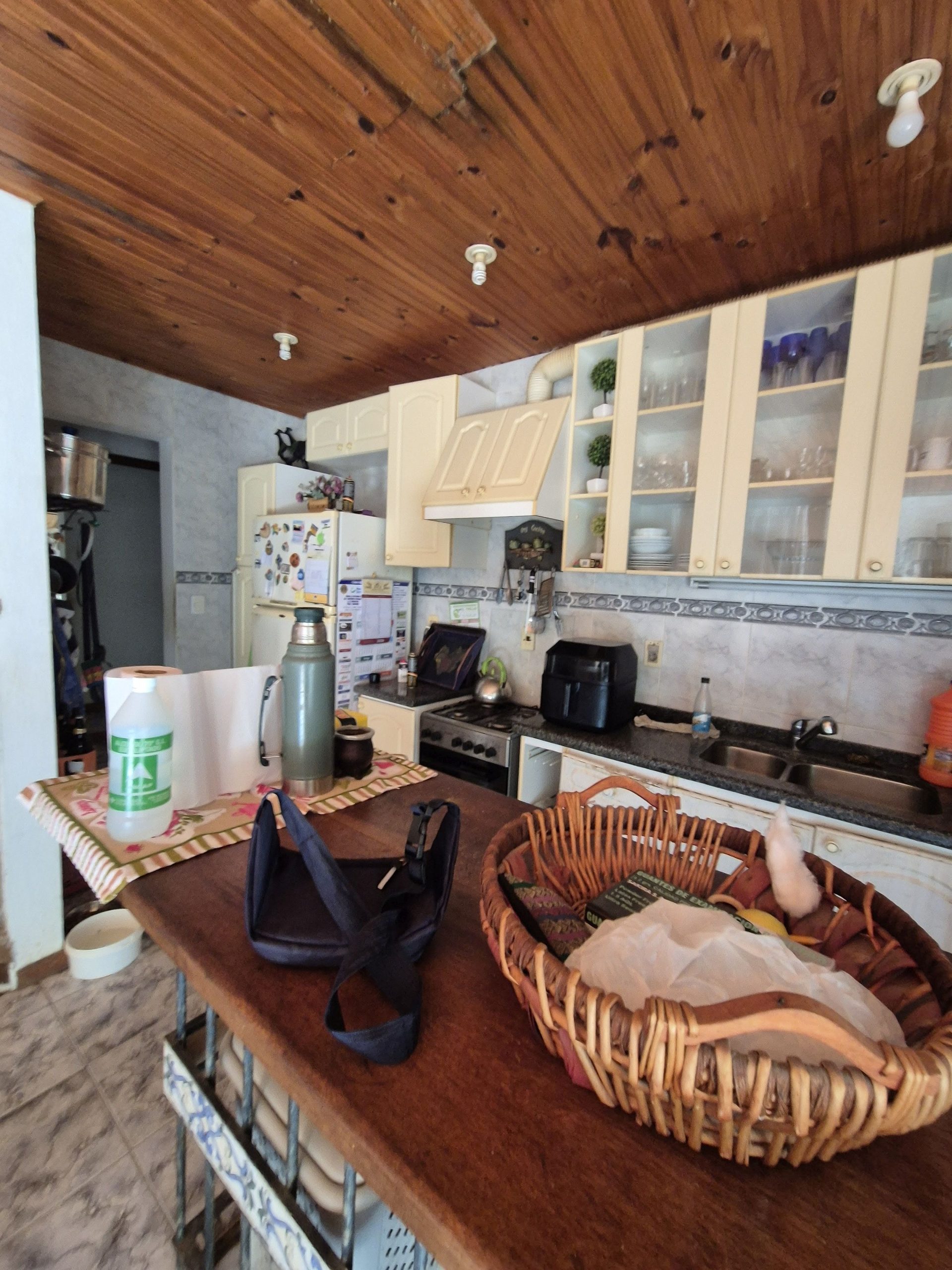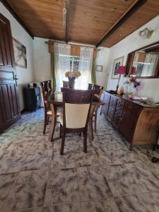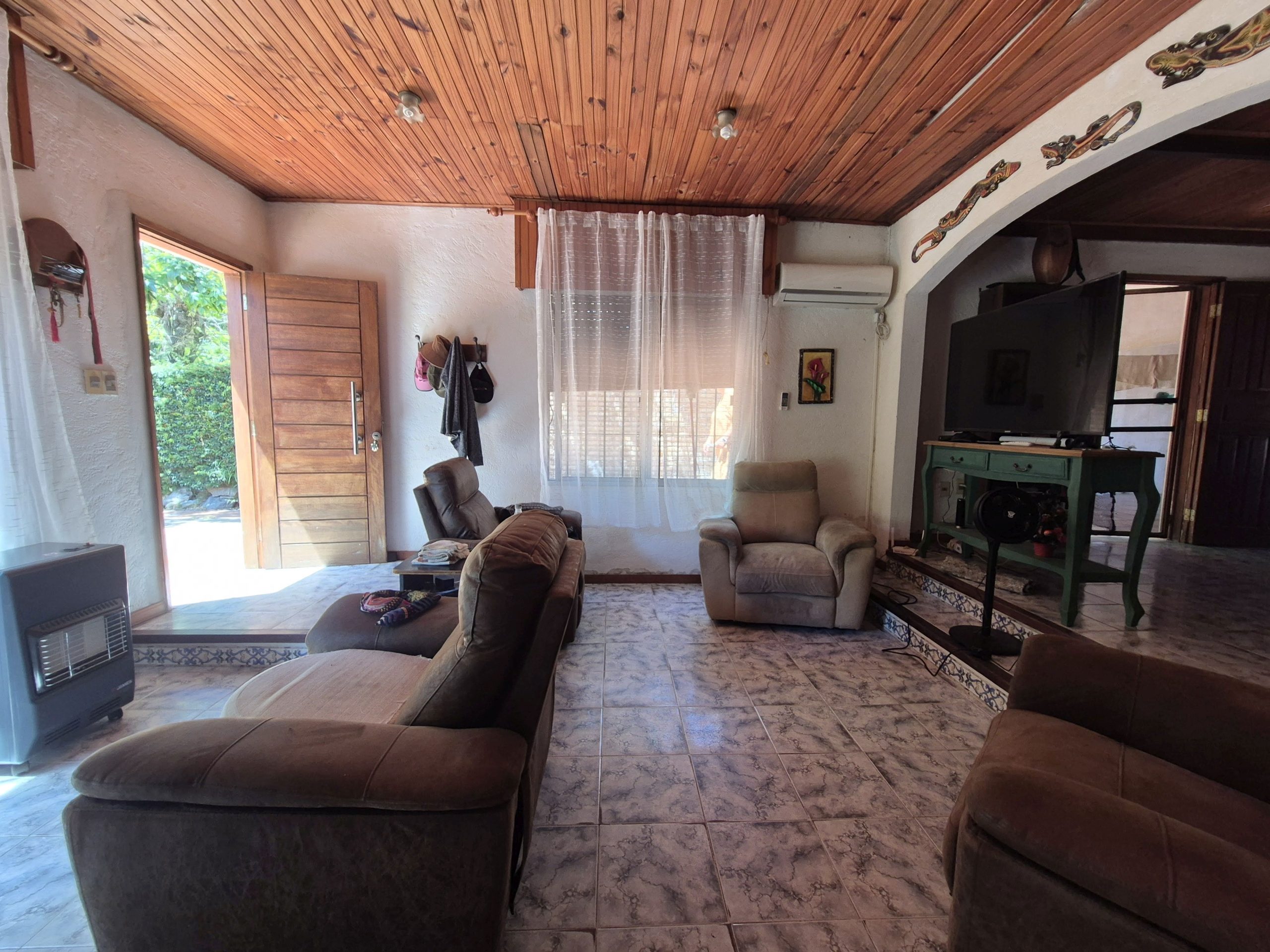 El diseño interior presenta ambientes como living, comedor y cocina, todos con terminaciones en madera en techos y detalles en pisos cerámicos, lo que aporta una estética tradicional y cálida.