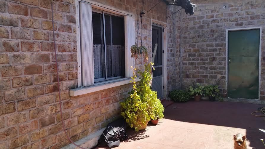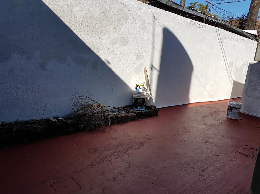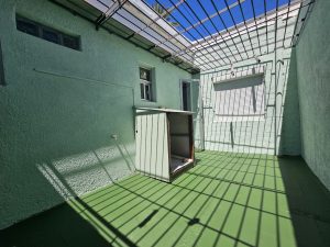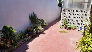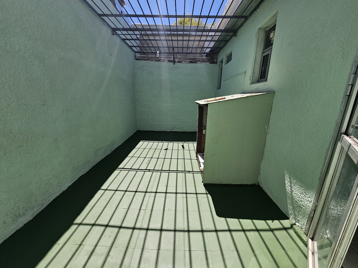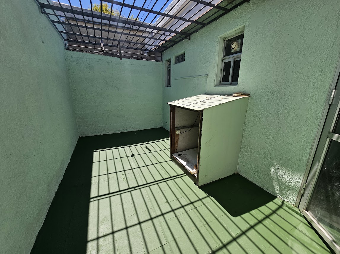 En el exterior, se observa un patio con piso de cemento y áreas de vegetación, además de un sector techado con estructura metálica, ideal para usos múltiples.