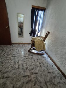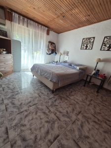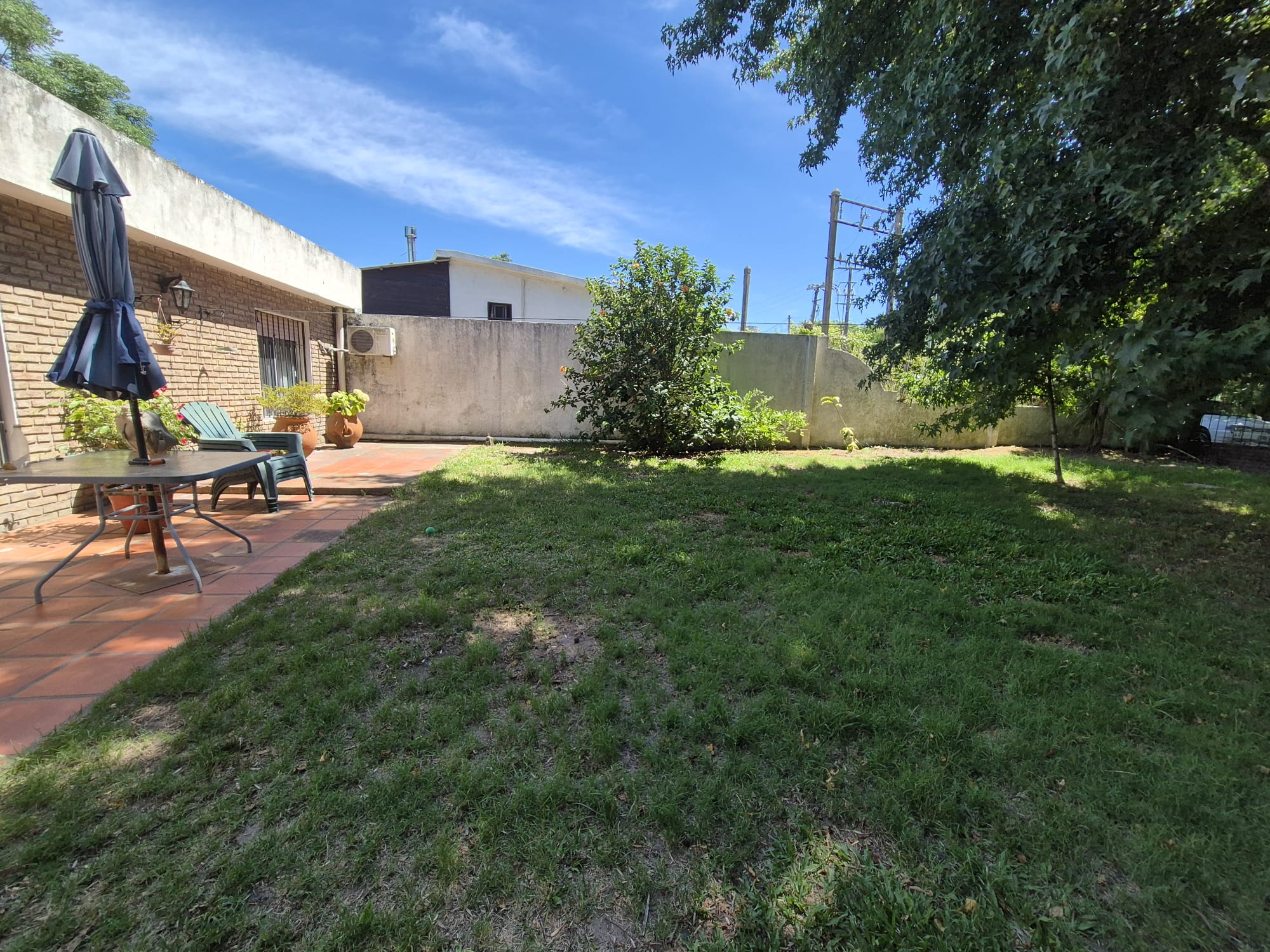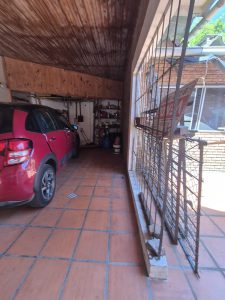El patio está revestido en cerámica y se extiende hacia áreas de descanso y circulación. La propiedad incluye espacio para estacionamiento bajo techo, aunque no cuenta con portón automático