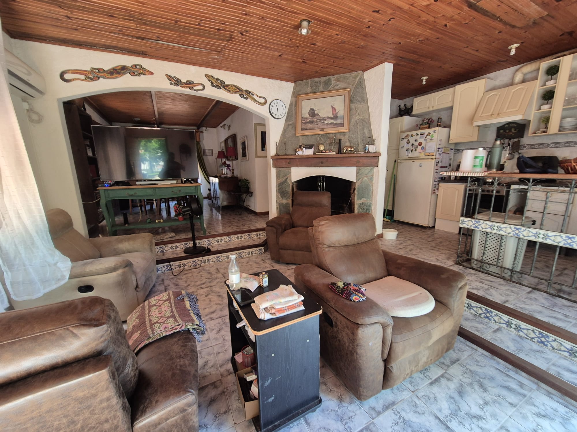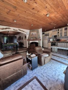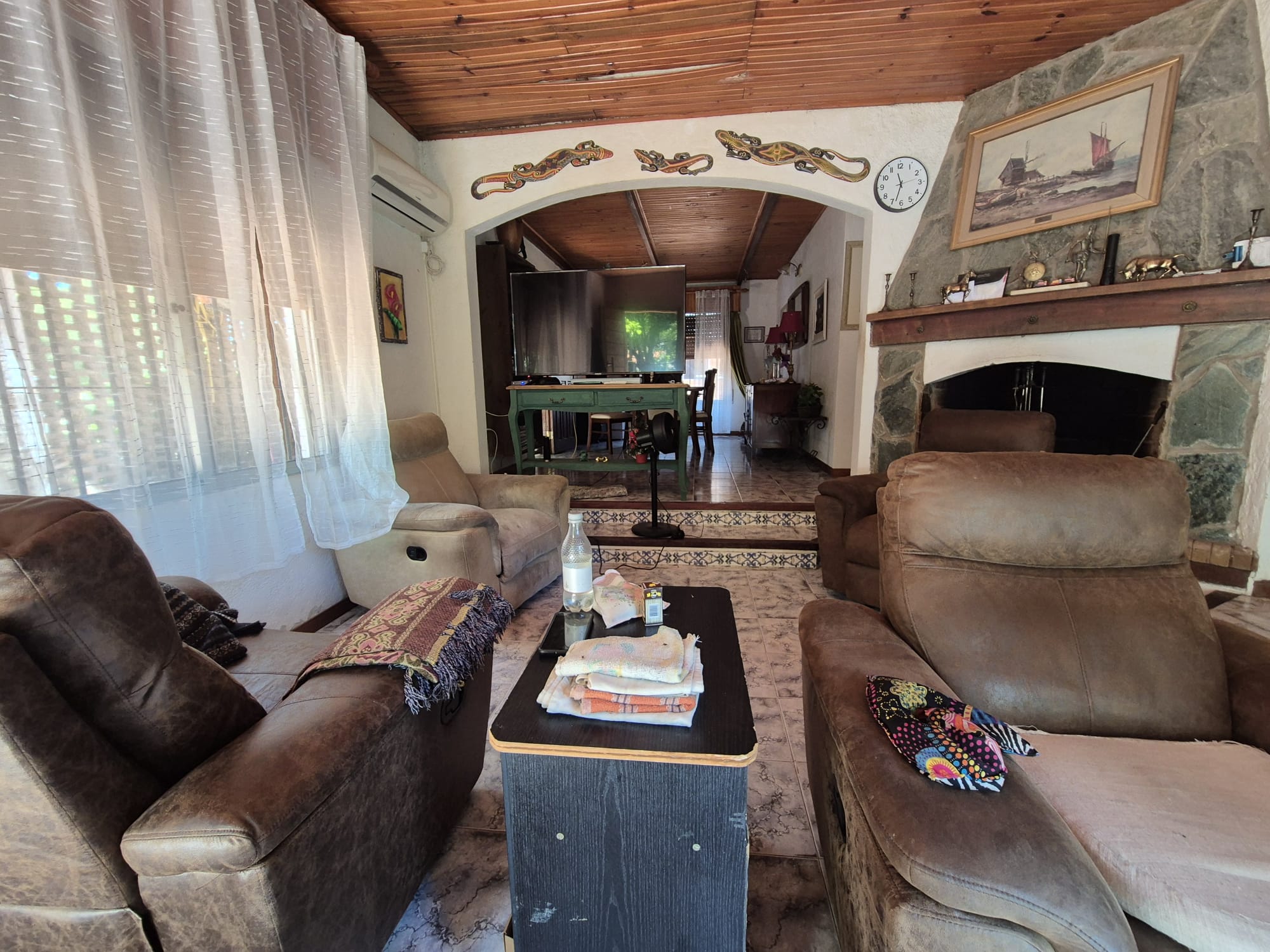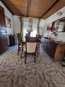 El diseño interior presenta ambientes como living, comedor y cocina, todos con terminaciones en madera en techos y detalles en pisos cerámicos, lo que aporta una estética tradicional y cálida.